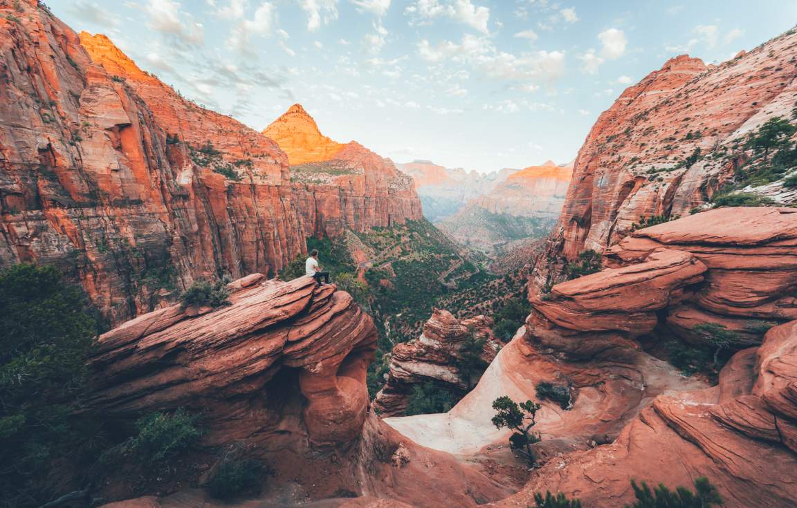 If you’re up early enough you’ll see a stunning sunrise as the dawn light gradually transforms the colours of the sandstone rock formations. Then head for Zion National Park, where water and time has carved the dramatic Zion Canyon, the centre piece of this remarkable national park, where sheer cliffs rise majestically from the canyon floor showcasing stunningly colourful layers of ancient rock.