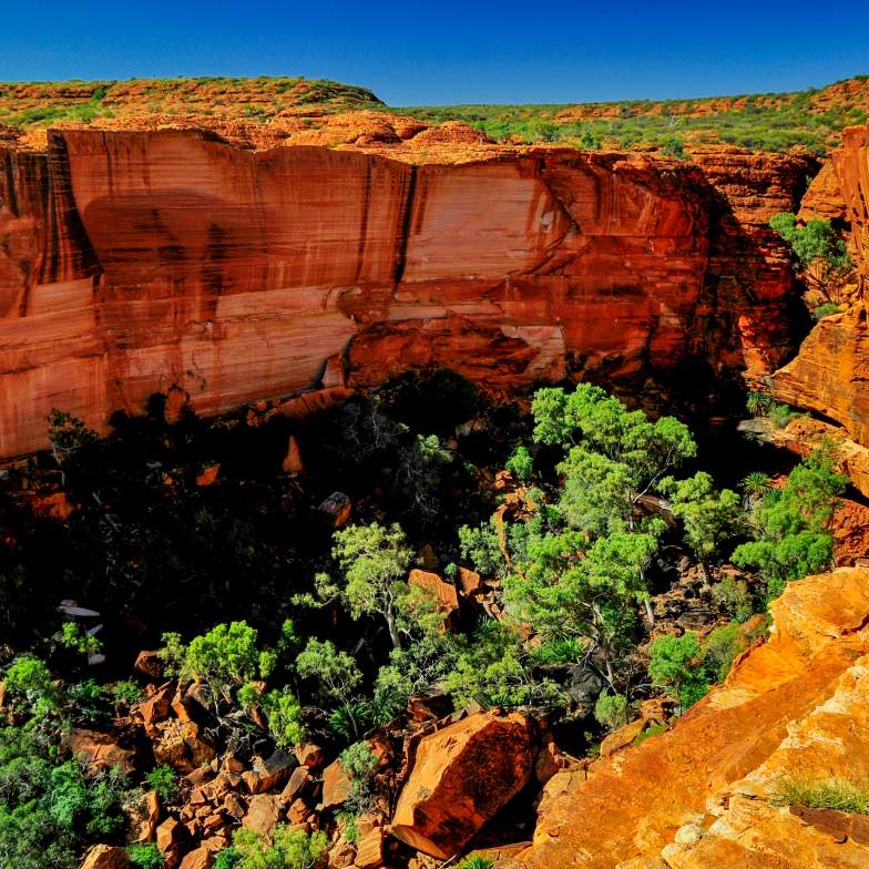 Travel to Kings Canyon. On the way marvel at Atila (Mt. Conner) the ‘forgotten wonder of Central Australia’. Continue to Kings Creek Station. Established in 1982 by Ian and Lyn Conway, the station was originally vacant crown land and covers an area of 1,800 square kilometres. It runs cattle and is the largest exporter of wild camels in Australia. Continue to Kings Canyon Resort and a 6km Rim Walk exploration of the spectacular Kings Canyon in Watarrka National Park. If you’d prefer a more relaxed walk there’s the option of a creek bed walk, where you’ll explore the rock-strewn canyon floor.