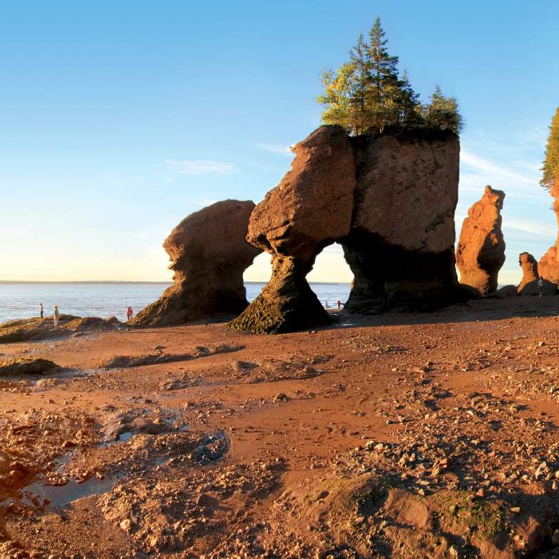 Visit one of the seven wonders of North America, the Bay of Fundy. Featuring the highest tides on earth, 169 billion tons of seawater flow in out of the bay twice a day. It's here that you will see the impressive Hopewell Rocks. These unique rock formations are caused by tidal erosion and stand 40-70 feet tall along the shoreline.